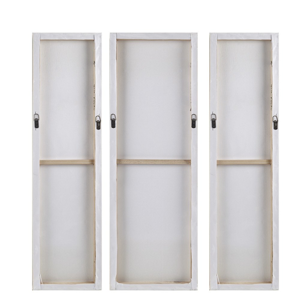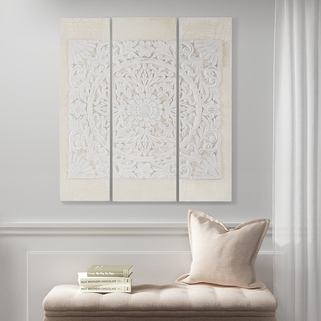 Hang our Madison Park Mandala Triptych 3-piece Dimensional Resin Canvas Wall Art Set on your wall to create a unique focal point in your space. An intricate carving design with the look and feel of wood is made from durable resin, then attached to the embellished canvas and set among each piece of this 3PC wall decor. The embellished canvas is featured in an off white washed tone and purposefully distressed, adding a rustic charm to the look. Globally inspired, this alternative wall decor adds a stunning texture and unique boho touch to any room in your home.